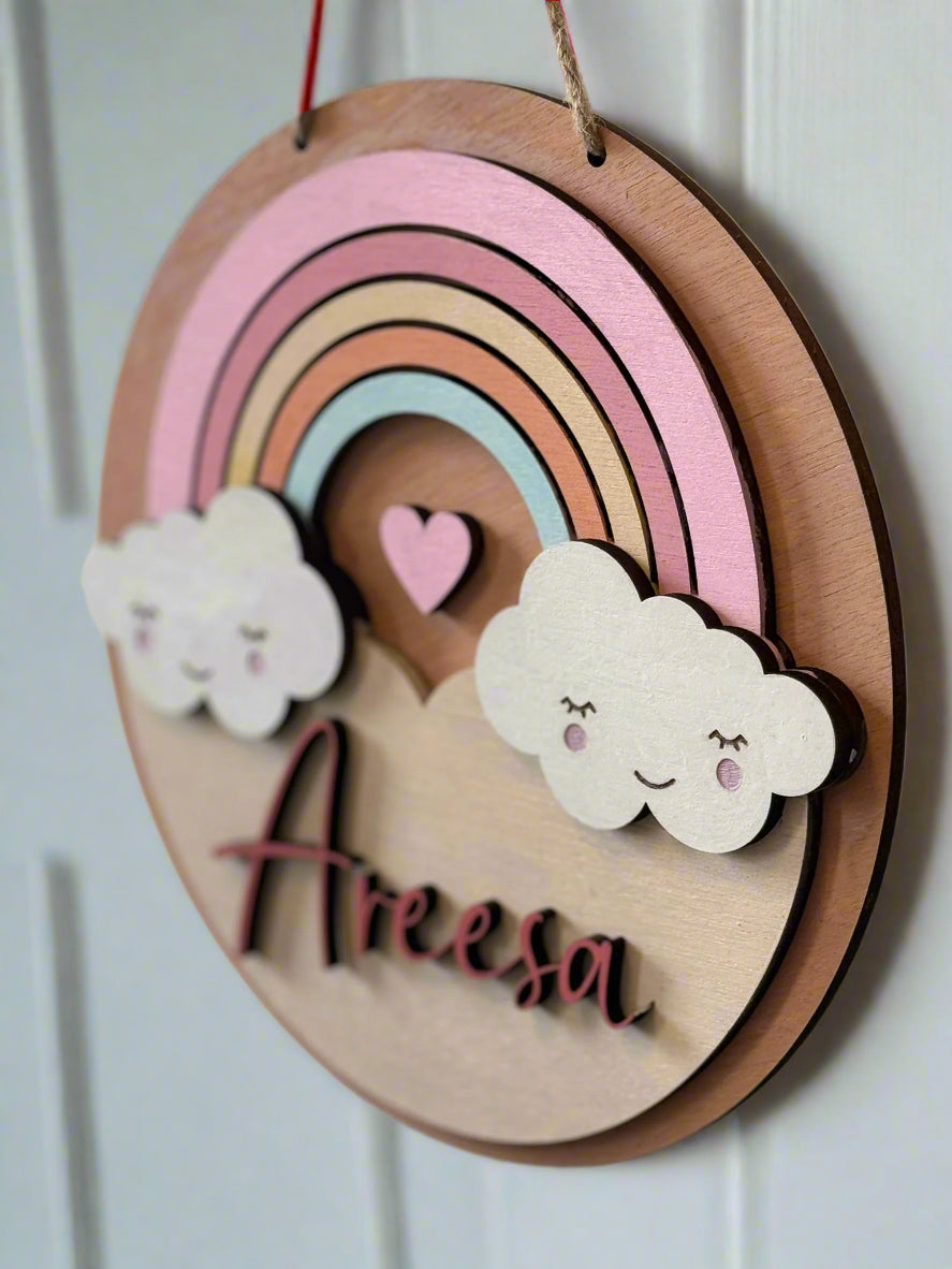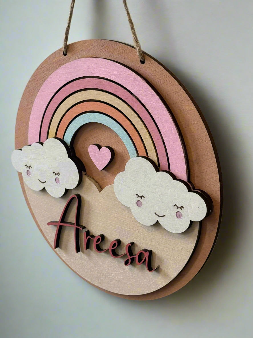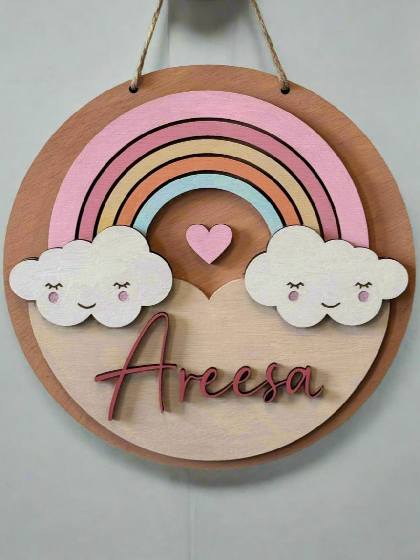 Brighten up your child’s space with this whimsical layered wooden door hanger, featuring a dreamy pastel rainbow, fluffy clouds, and a sweet-heart accent. Expertly crafted using precision laser-cut wood and hand-painted with soft, warm hues, this custom name sign adds a magical touch to nurseries, kids' rooms, or as a unique baby shower gift.